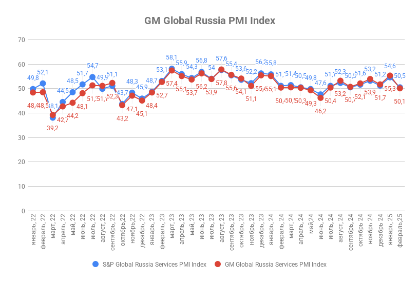 В феврале 2025 года индекс деловой активности в сфере услуг, известный как GM Global Services Russia PMI Index, продемонстрировал снижение с 55,3 до 50,1 п.п. За тот же период индекс деловой активности S&P Global (Global Russia Services PMI by S&P Global) снизился с 54,6 до 50,5 п.п.