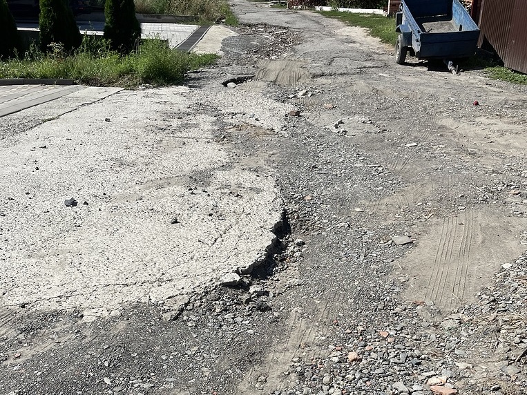 Соседи часто засыпают ямы чем могут, но дорога имеет склон - и во время дождей все смывается, в связи с чем необходимо асфальтовое покрытие.