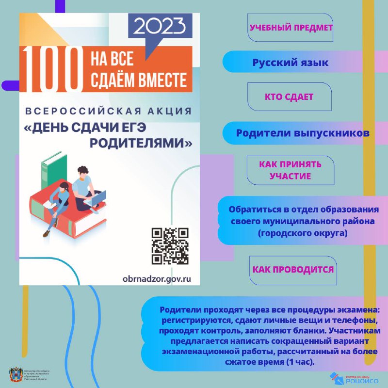 С 1 по 31 марта 2023 года Федеральная служба по надзору в сфере образования и науки проводит Всероссийскую акцию «Сдаем вместе. День сдачи ЕГЭ родителями» . Город Новошахтинск традиционно поддерживает акцию и организует ее проведение.