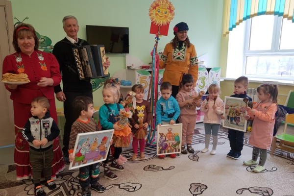 Вместе со скоморохами дети поиграли в игры «Лепим снежки», «Печем блины», «Согреем солнышко ладошками». Дети провожали Зиму и встречали Весну дружным оркестром и хороводом «Карусель», отгадали загадки «Из чего печем блины?»