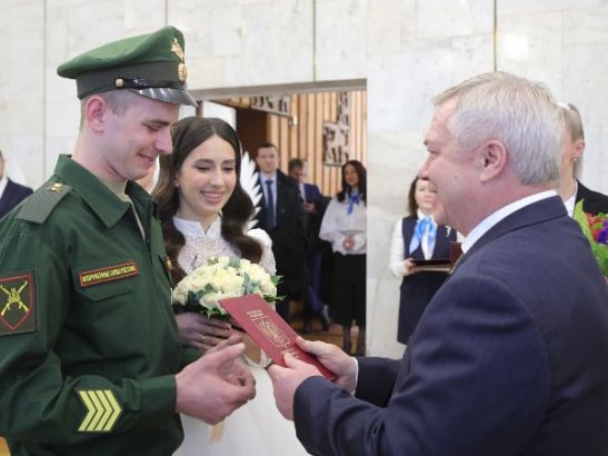 Губернатор Василий Голубев поприветствовал молодых семей, а также вручил молодоженам документы о заключении брака, а родителям новорожденных – свидетельства о рождении.
