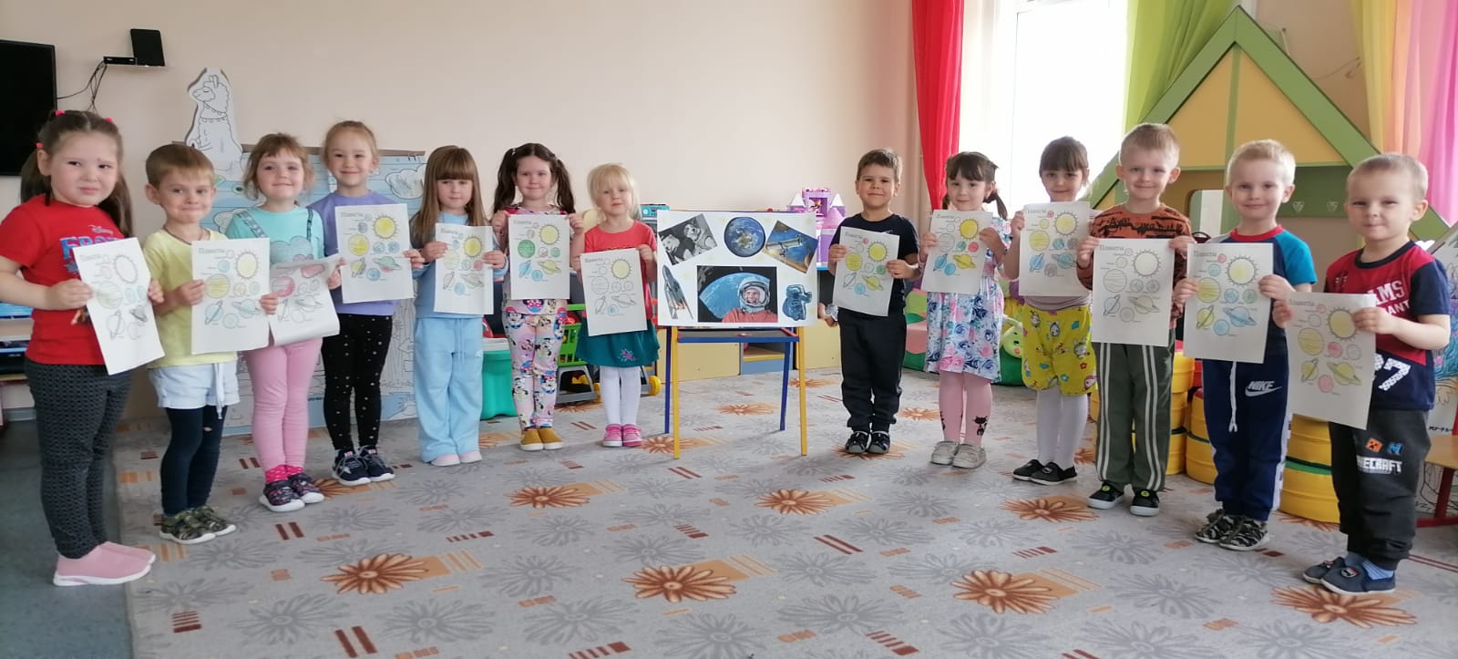 Воспитанники с большим интересом слушали рассказы о первом человеке, отправившемся покорять космическое пространство - Юрии Гагарине, о собаках Белке и Стрелке, которым удалось до человека побывать в космосе, узнали много интересного об учёных, стоявших у истоков развития космонавтики, о планетах Солнечной системы, о космических полётах. С большим удовольствием собирали ракету из геометрических фигур, изготовили ракету из бумаги в технике оригами.