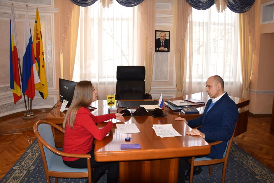 Председатель городской Думы – глава города Шахты Константин Корнеев провел рабочую встречу с руководителем ШМО Российского движения детей и молодежи «Движение Первых» Юлией Столбов