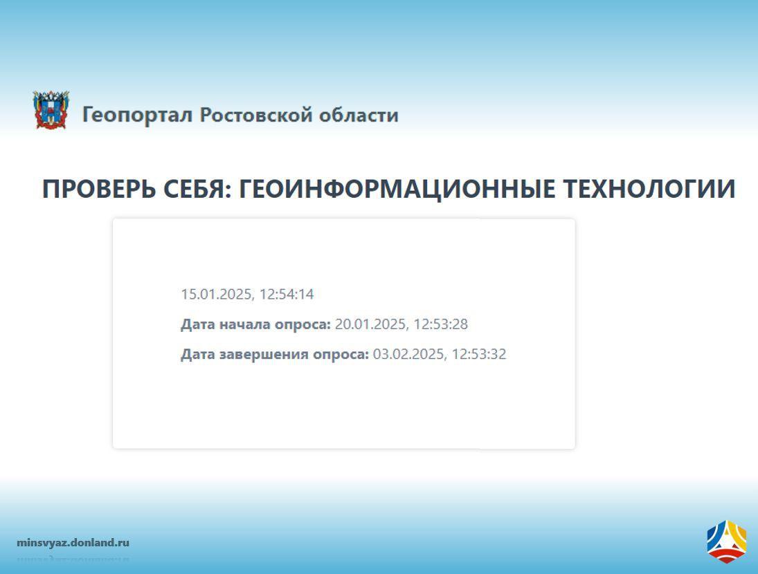 Геопортал региона также предоставляет возможность поучаствовать в тематических опросах и проверить свои знания в области геоинформационных технологий. А прямо сейчас можно пройти опрос, перейдя по ссылке: