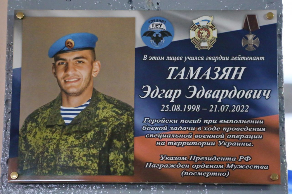 Мемориальную доску с портретом Эдгара Тамазяна разместили в фойе напротив главного входа в учебное заведение. Под ней на школьной парте – голубой десантный берет, орден мужества и наградное удостоверение – эти вещи школе передала семья Эдгара.