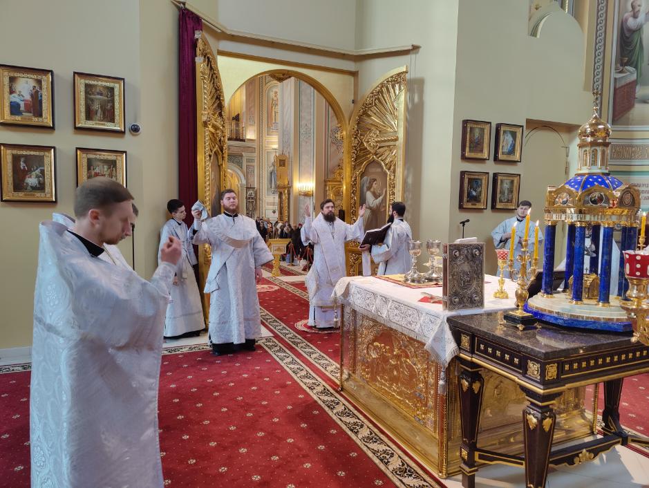 Песнопения богослужения исполнил хор собора под управлением протодиакона Владимира Зубрицкого. Проповедь перед Причастием произнес протоиерей Сергий Зрянин.