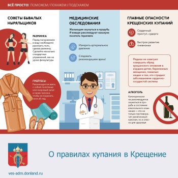 1. Окунаться (купаться) следует в специально оборудованных в преддверии Праздника Крещения для массового купания граждан прорубях у берега, вблизи спасательных станций, под присмотром спасателей. О нахождения таких мест населени информируют через средства массовой информации.