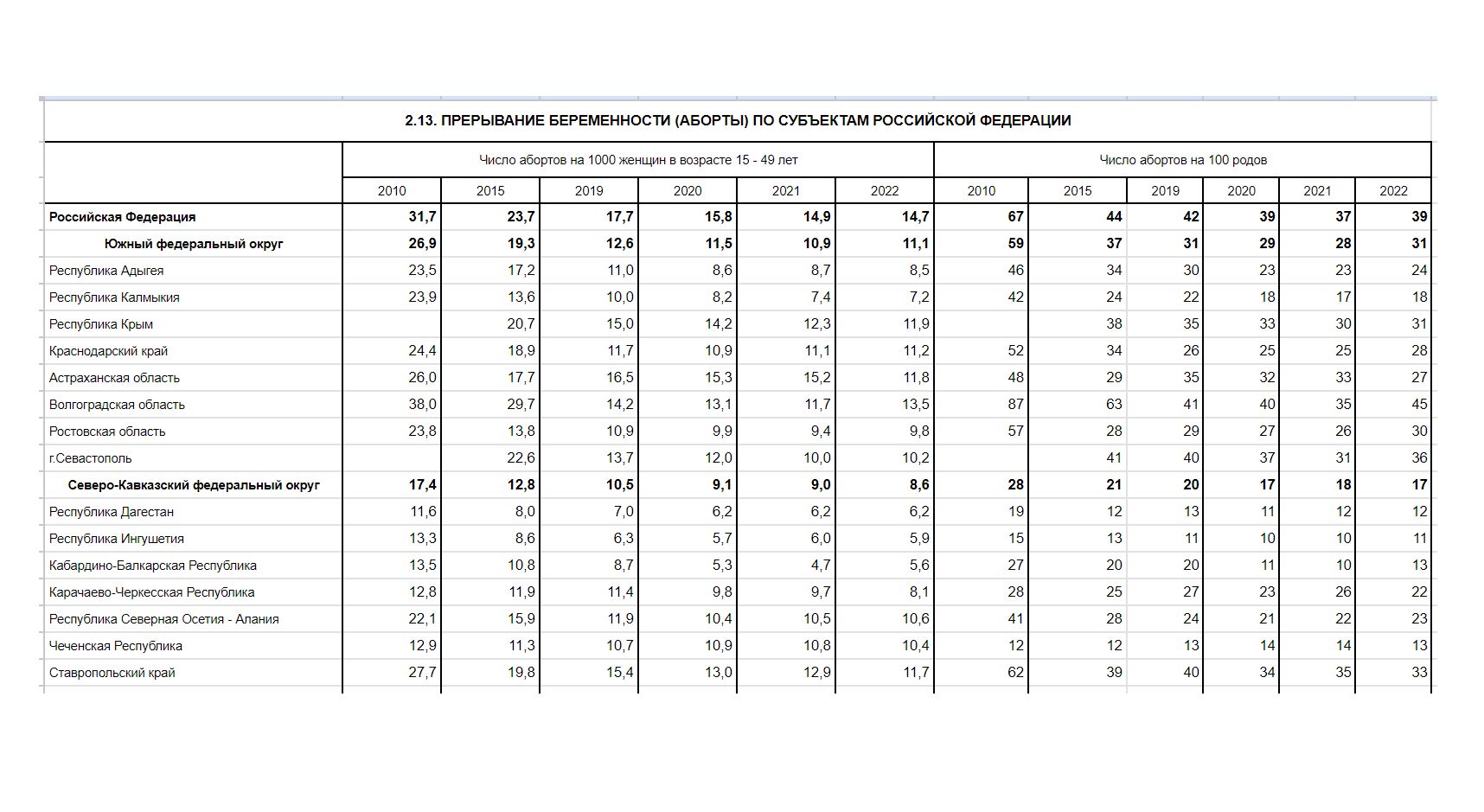По данным Росстата, в Краснодарском крае и Ростовской области с 2020 по 2022 год увеличилось количество абортов. В 2020 году на Кубани на 1000 женщин в возрасте от 15 до 49 лет приходилось 10,9 прерываний беременности. В 2021 году данный коэффициент абортов в регионе достиг 11,1, а в 2022 году — 11,2. При этом в Краснодарском крае количество прерываний беременности на 100 родов в 2020 и 2021 году ровнялось 25, а в 2022 году — 28.