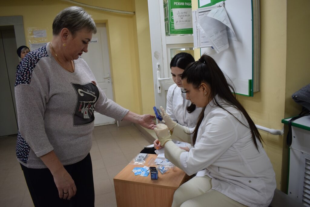 Одновременно все желающие сальчане смогли пройти скрининг на выявление сахарного диабета второго типа. С утра — в час пик, когда наблюдается наибольший наплыв пациентов, прямо в холле поликлиники людям предлагали измерить уровень сахара крови — с этим, по традиции, помогают студенты Сальского медицинского техникума.