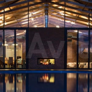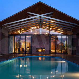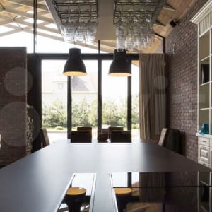 В доме весьма условны границы между внешним и внутренним: стены в интерьере отделаны тем же кирпичом ручной формовки, что и фасад; камин работает на две стороны, а огромные витражи по бокам от камина можно раздвинуть, чтобы объединить гостиную и террасу с бассейном. Центральное пространство дома — гостиная, столовая и кухня — демонстрирует красоту обнаженной кровли. Кухонная зона спроектирована так, чтобы можно было присматривать за детьми, не отрываясь от приготовления еды: вместо фартука над столешницей установлен витраж, через который видна игровая комната. В доме 4 спальни - 2 детские с индивидуальными гардеробными, хозяйская спальня с гардеробом и гостевая. 3 санузла. Бассейн с подогревом и роллетой подходит для круглогодичного использования.