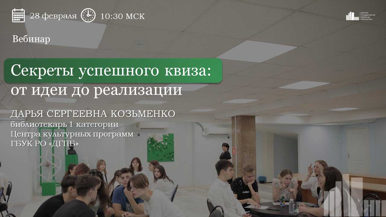 В рамках вебинара участники узнают отличительные особенности квиза - командной образовательной игры в формате «вопрос-ответ». Рассмотрят основные этапы его разработки и проведения, структуру раундов и форматы вопросов, необходимые технические требованиями, эффективные способы продвижения библиоквиза для участников программы «Пушкинская карта» на основе опыта Донской государственной публичной библиотеки.