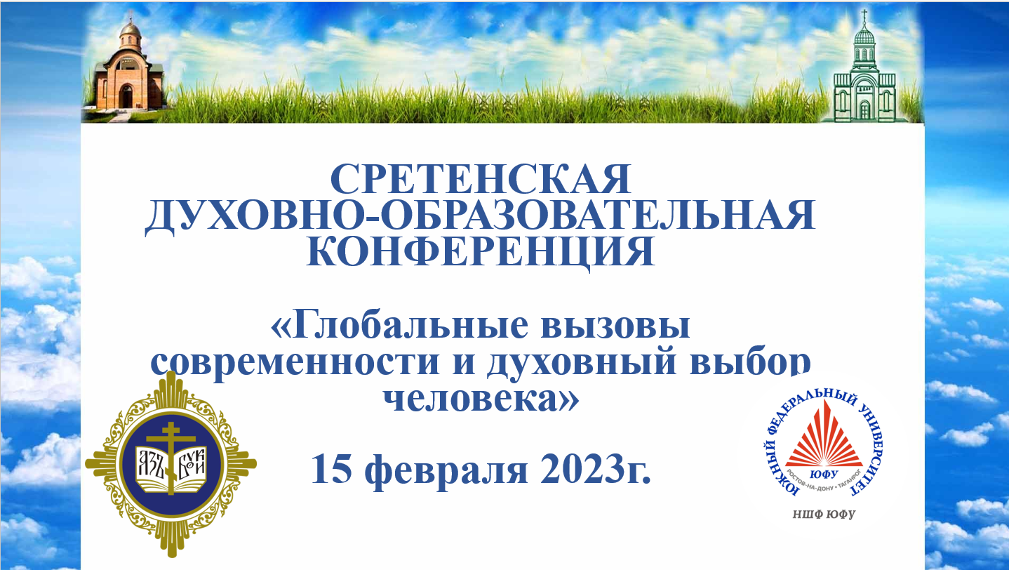 15 февраля 2023 года в 13:30 в филиале ЮФУ в г.Новошахтинске состоится Сретенская духовно-образовательная конференция "Глобальные вызовы современности и духовный выбор человека".