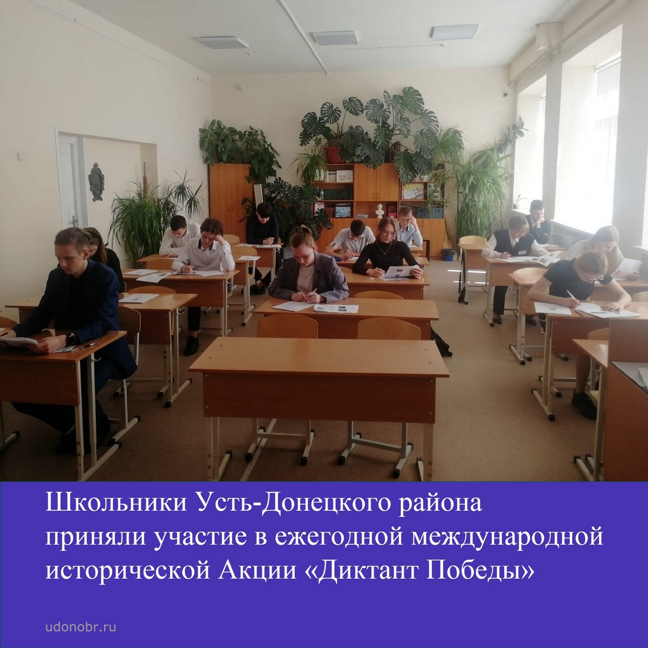 27 апреля учащиеся Усть-Донецкого района приняли участие в ежегодной международной исторической Акции «Диктант Победы», которая традиционно проводится в рамках проекта "Историческая память" в преддверии 9 Мая.