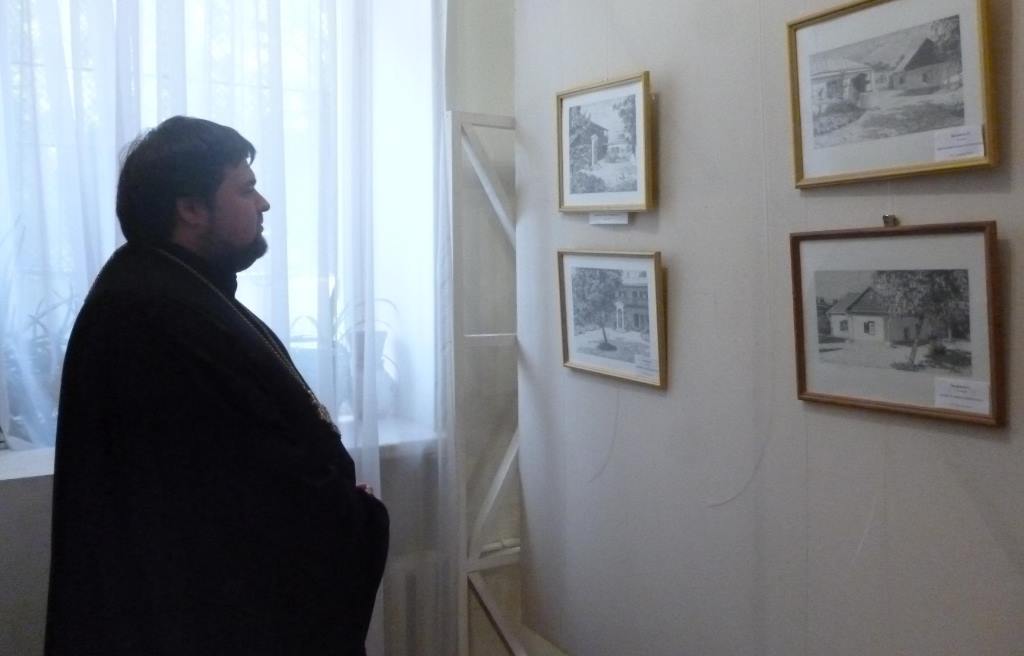 На открытии выставки побывал настоятель Никольского храма иеромонах Маврикий (Звягинцев). Особое внимание он обратил на серию графических работ, посвященных келье святого праведного Павла Таганрогского, нарисованных по благословению протоиерея Алексея Лысикова.